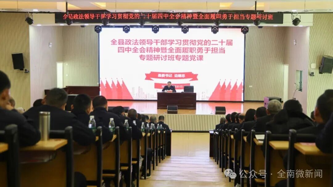 ——要学深悟透党的二十届四中全会精神。党的二十届四中全会,是在我国迈上全面建设社会主义现代化国家新征程、向第二个百年奋斗目标进军的关键时刻召开的一次具有全局性、历史性意义的重要会议。全县政法系统领导干部要深刻认识“十四五”时期取得的重大成就、我国面临的发展环境、经济社会发展的主要目标、战略任务和“六个坚持”重大原则,把学习好、宣传好、贯彻好全会精神作为当前和今后一个时期的首要政治任务,深入学习全会提出的新思想、新观点、新任务,找准政法工作着力点、结合点、落脚点,推动全会精神在政法系统落地生根、开花结果,为我县“十四五”圆满收官和“十五五”良好开局贡献政法力量。